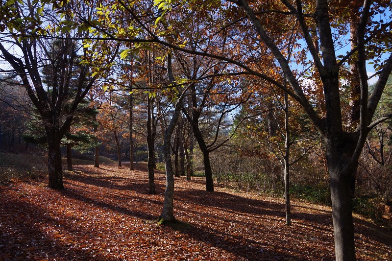 落ち葉が敷き詰められた林に差し込む日差しも低くなり、木の影もかなり長く伸びています。冬はすぐ近くまでやって来ているようですね。