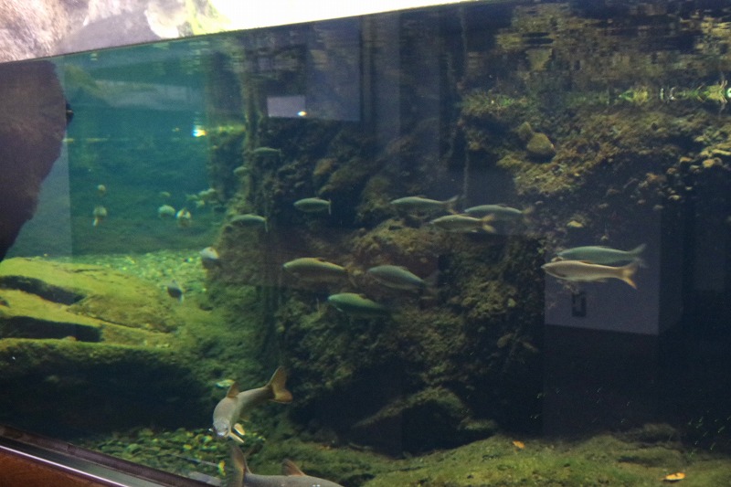 水槽の水流は左から右へと流れているので、ウグイたちは水が流れてくる左の方向を向いています。水槽の中にある2つの島の周りを泳ぎますよ。