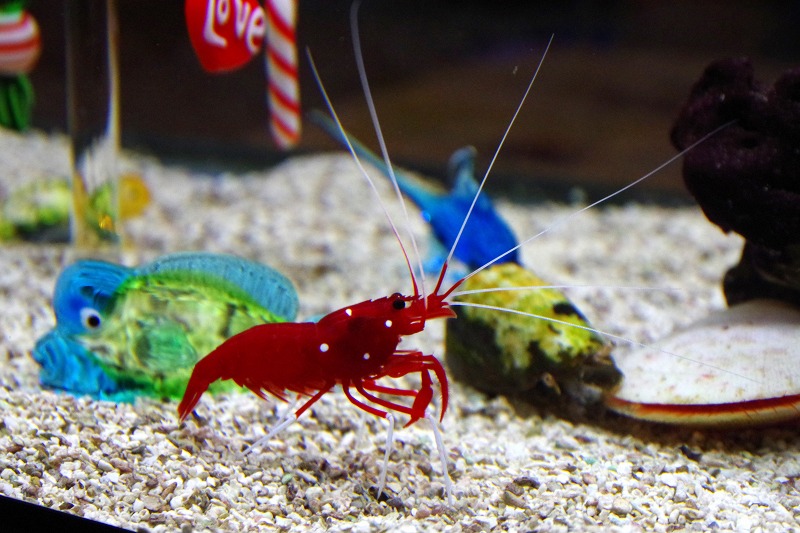 昨日紹介したオトヒメエビと同じ水槽に暮らしているのはシロボシアカモエビ。この水槽のメインです。赤と白の体色とホワイトソックスという英名から〝サンタエビ〟の愛称でも親しまれています。まさに水中のサンタクロースです。
