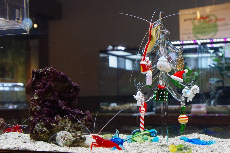 先週のオトヒメエビやサンタエビに続き、今日もエビの話題です。水槽の中に飾られたガラスのクリスマスツリー。ツリーのてっぺんにはガラス細工のエビ?