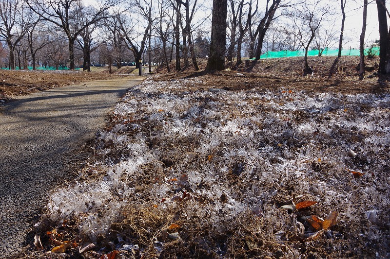 新しく造成した植え込みにも長い霜柱も出来ていました。来週も気温は低いようです。もう少し冬の装いで散策した方が良いようですね。