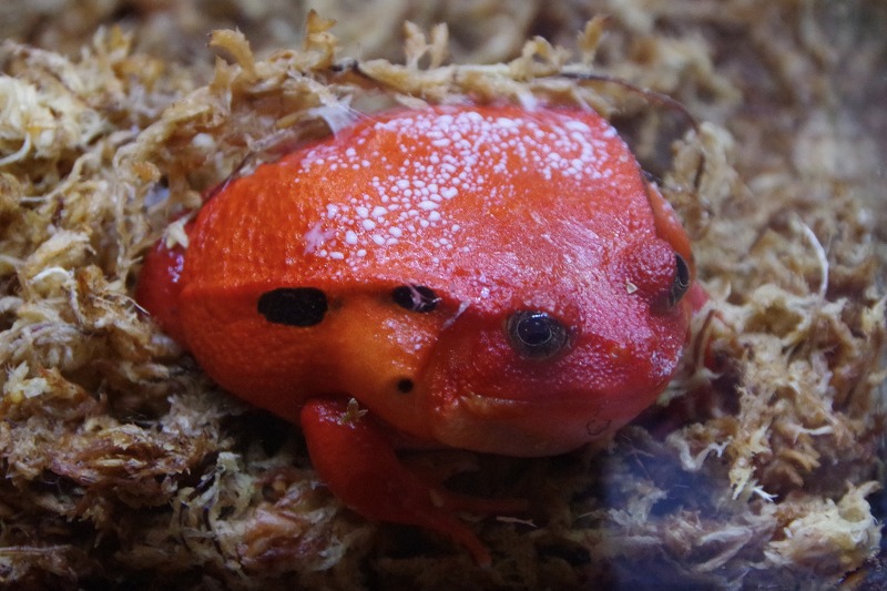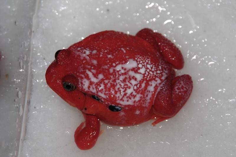 一昨日の夜、特別展示『トロピカル クリスマス』の〝へんてこガエル〟に異変が発生。アカトマトガエルの背中から白い液体が出ていましたよ。