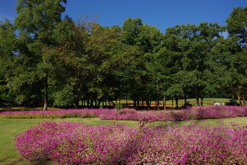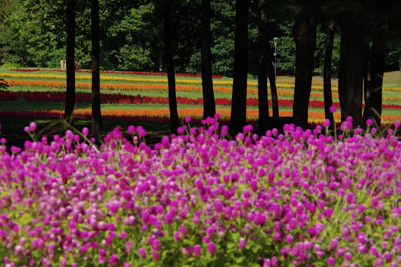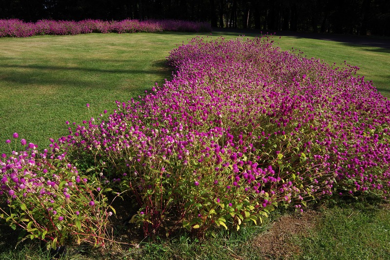 こちらは穂高口南側のセンニチコウ。見晴らしの丘との間には、クヌギやウワミズザクラの林があります。ケイトウに影を落としていた林です。