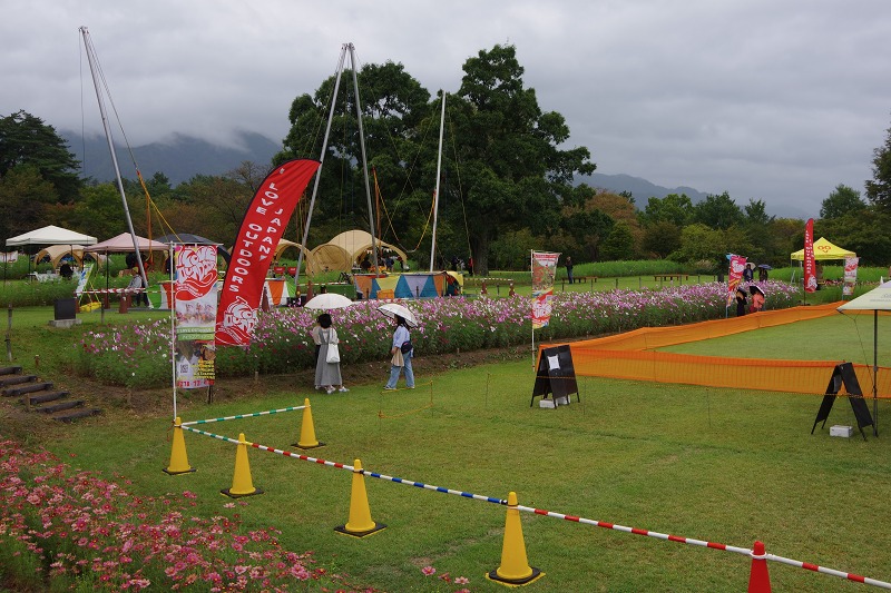 今日は無料入園日。段々原っぱでは『アウトドアパーク&クラフトマルシェ』が開催されました。でも1日を通して小雨の降る、残念なお天気になりました。