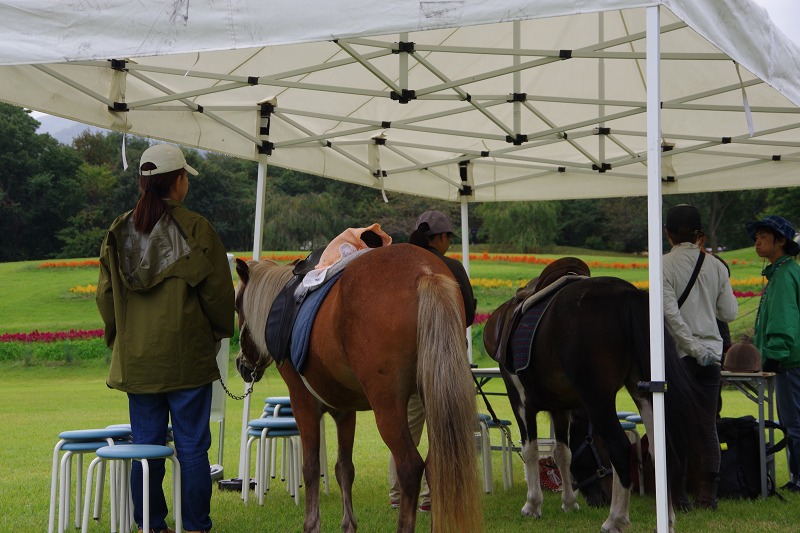ケイトウの咲く穂高口前の見晴らしの丘では「ポニーの乗馬体験」もやって来ました。雨降りなのでポニーさんたちもテントの下で雨宿りです。