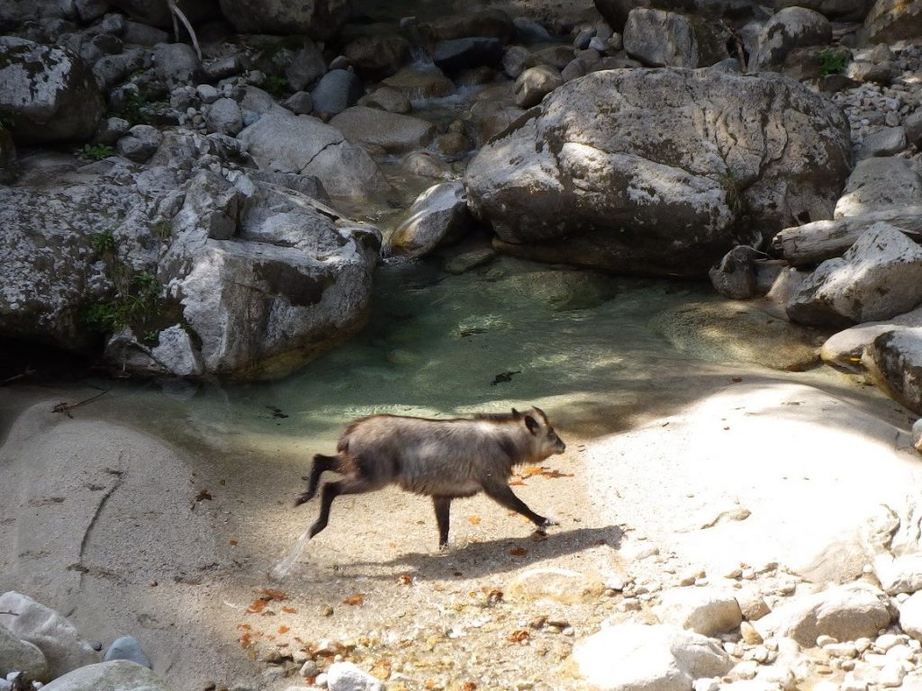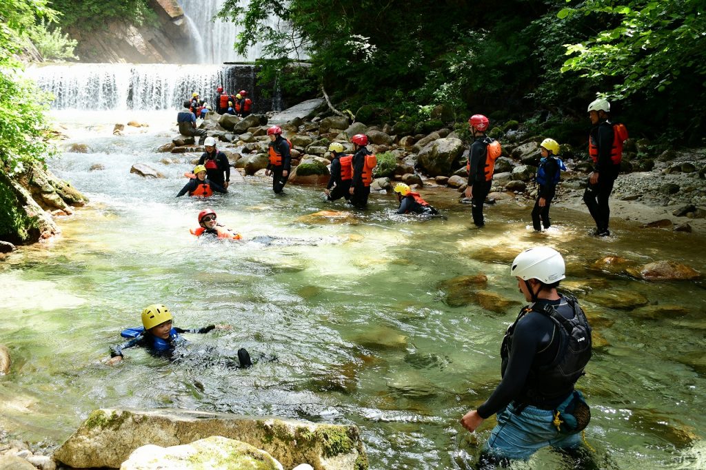1日目は、北アルプスから流れる美しい乳川で、ウエットスーツを着て思いきり川遊びができる「シャワーピクニック」 。