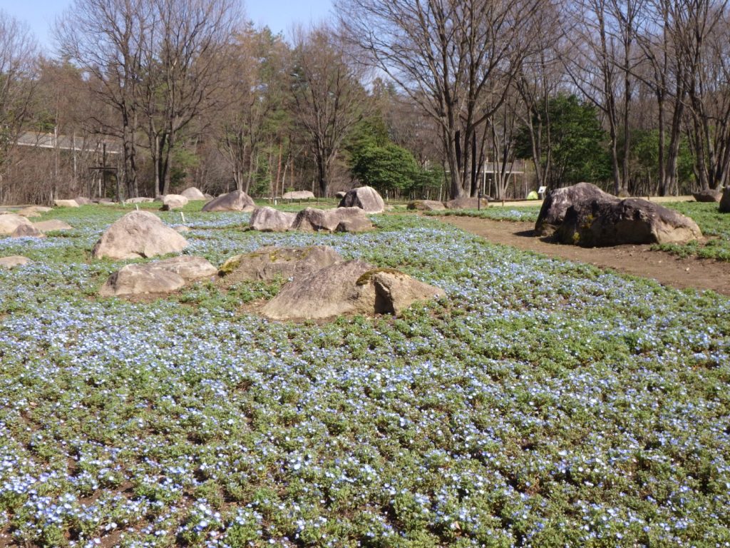 れき原の花畑のネモフィラ、青い絨毯はもう少しお待ちください。