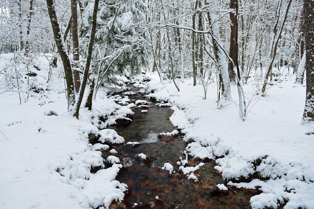 「渓流ピクニック広場」では、「横溝堤」の流れと雪のコントラストが美しく、写真撮影にもおすすめです。