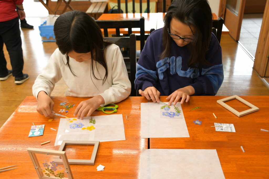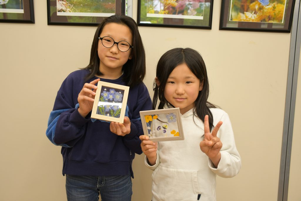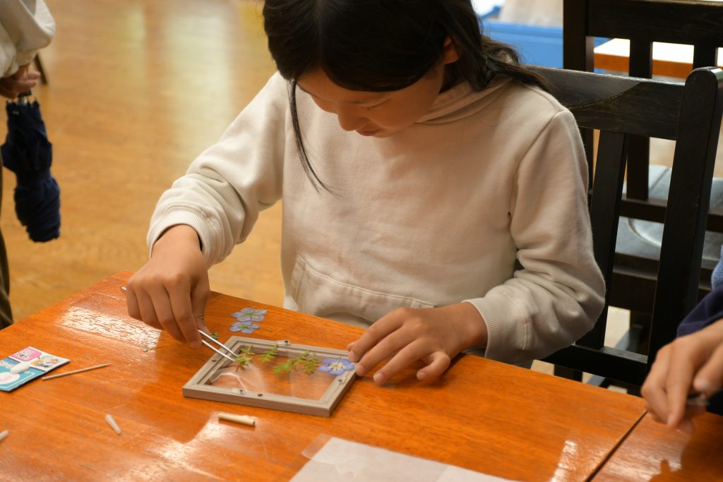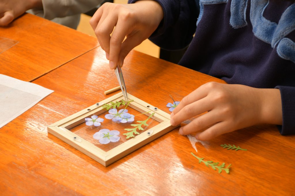 れき原の花畑に咲くネモフィラや園内の草花を使った「押し花フレームを作ろう」を開催しました 。