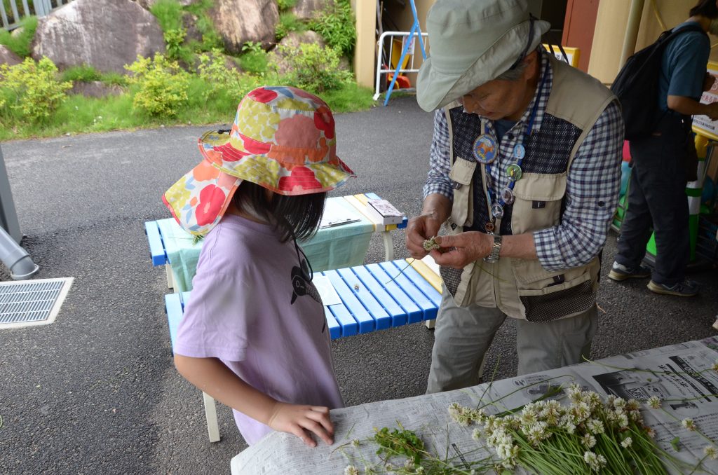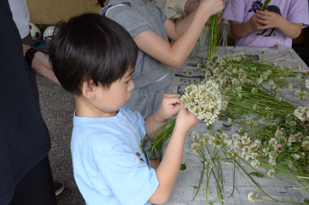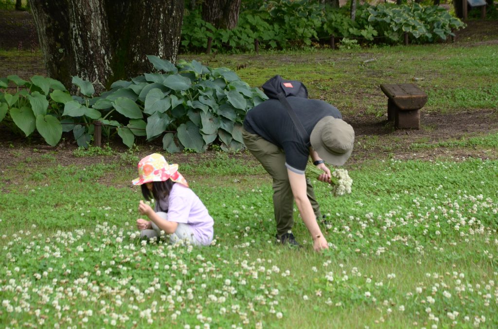 雨が降ったり、止んだりの変わりやすいお天気でしたが、アルプス大草原にて、「シロツメクサの花あそび」を開催しました。