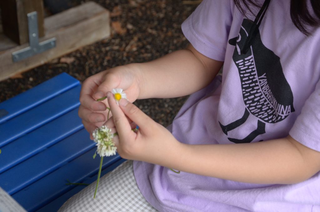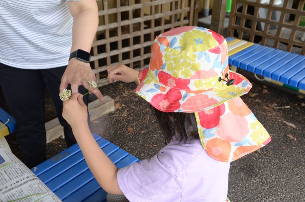 みなさん、思い思いのシロツメクサの花飾りや花束を作って、花あそびをされていました。