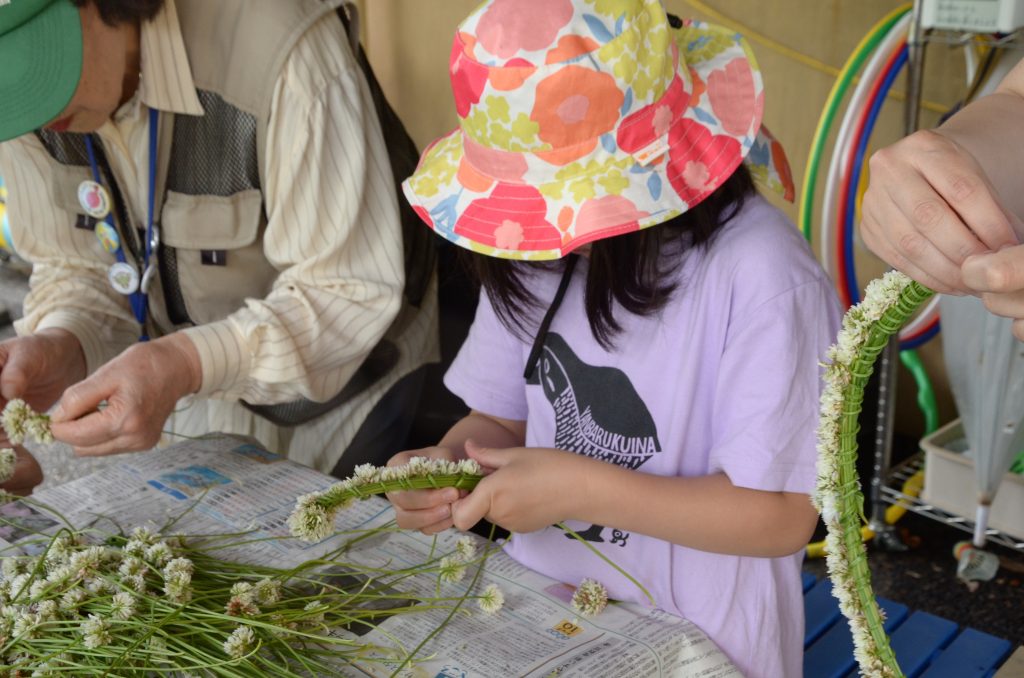 ご家族でシロツメクサの花飾りを一生懸命作られていました。