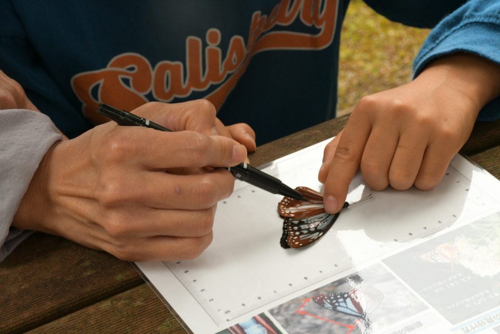 捕まえたアサギマダラは、翅の長さや色、性別などを観察し、油性ペンで調査地名や調査日などを翅に記入する「マーキング調査」ができます🦋