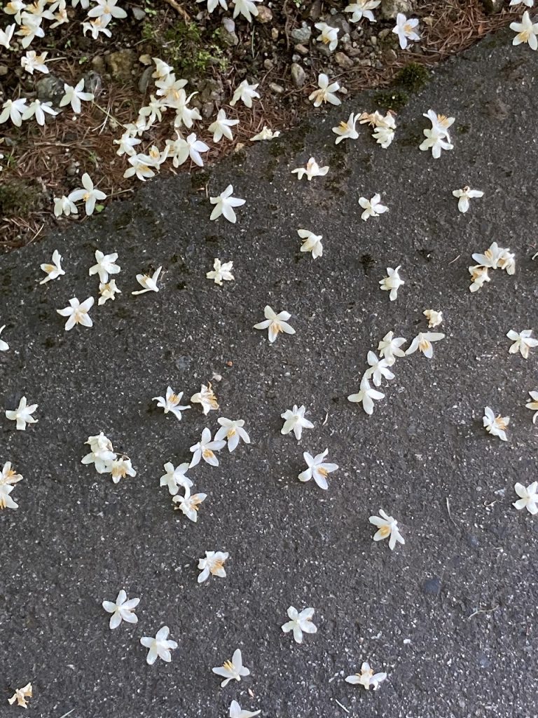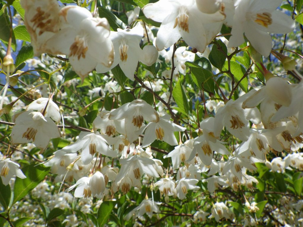 あちこちでとても目に付くエゴノキの白い花。香りもほのかに漂ってきます。ものすごい数の花が緑の葉の下にぶら下がっています。