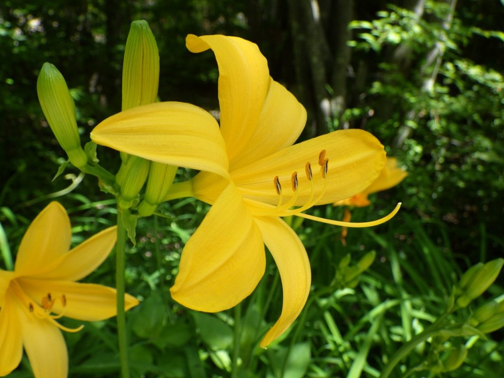 一番派手な大きな花はニッコウキスゲ。蕾はバナナそっくりです。毎日順番に開花していきます。