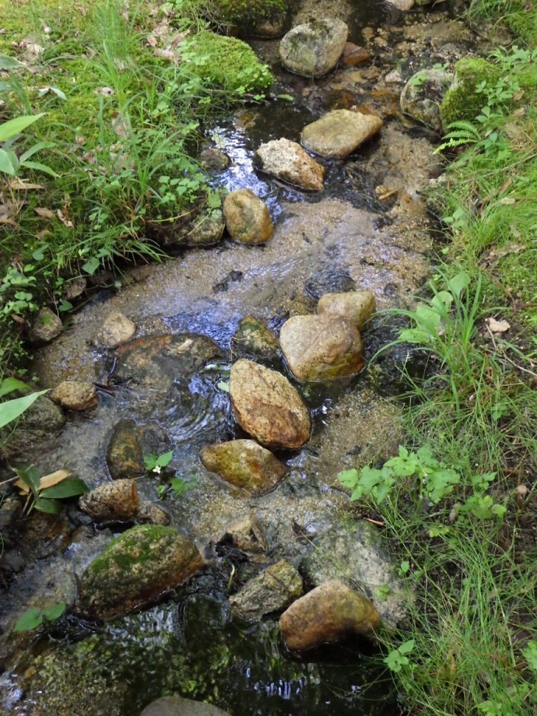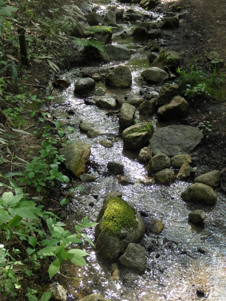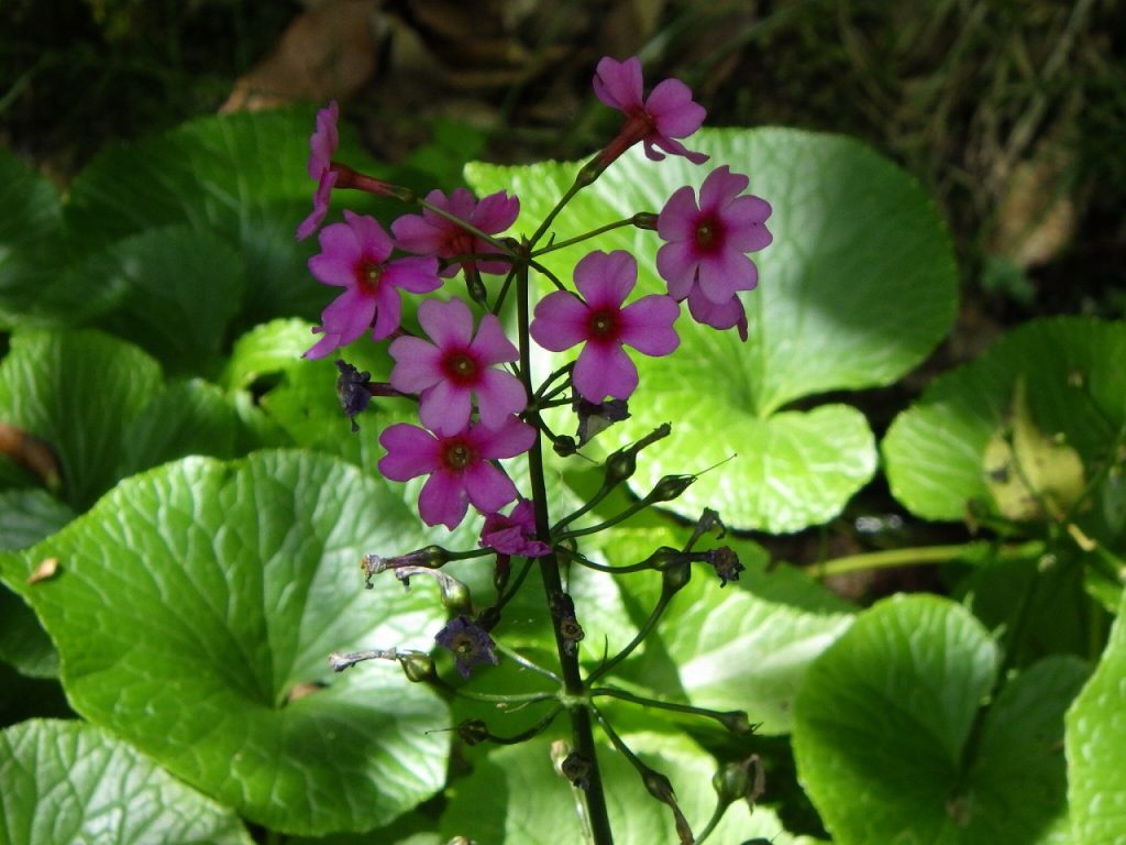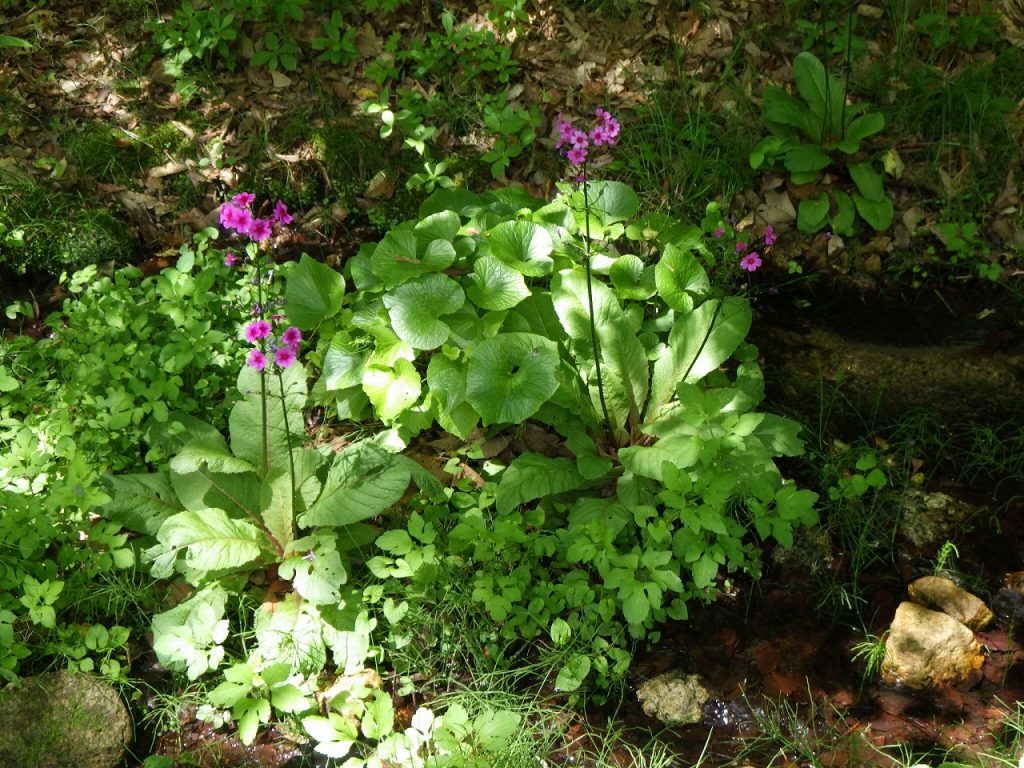 せせらぎの小道は涼しく、気持ちのいい散策路。途中には色鮮やかなクリンソウが。一緒に見られる緑の葉はワサビです。