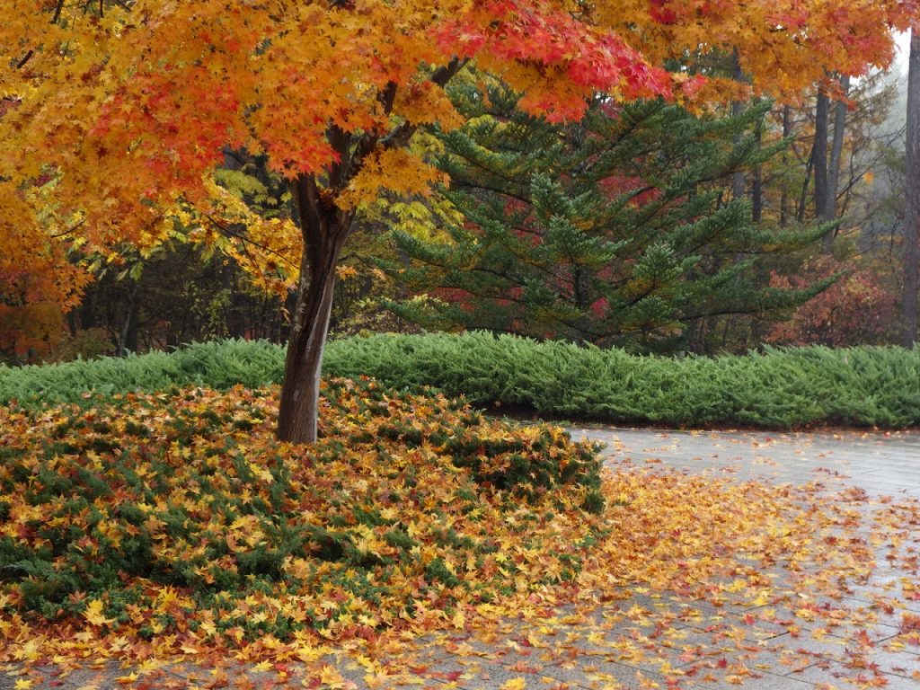 園内は紅葉の見頃を迎えています。霧に煙る景色も風情があります。