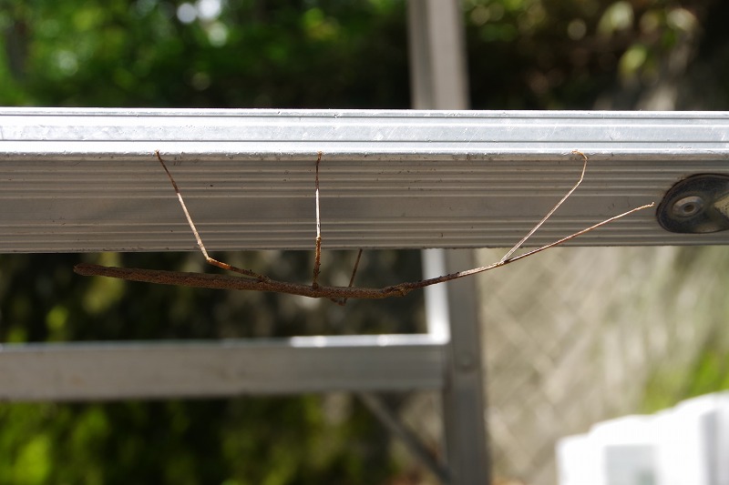 正解はステップの裏側でした。先日も紹介したエダナナフシです。トコトコ歩いてると偶然目の前に三脚。直射日光を避けて一休みしていたようです。