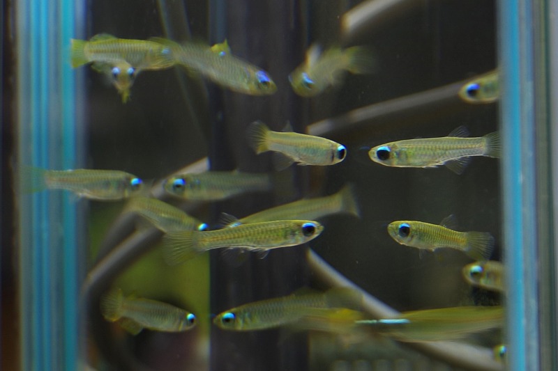 熱帯地域にもメダカの仲間はたくさんいます。目の上が青く光るのはアフリカンランプアイ。群れで泳ぐと、まるで蛍が乱舞しているようです。