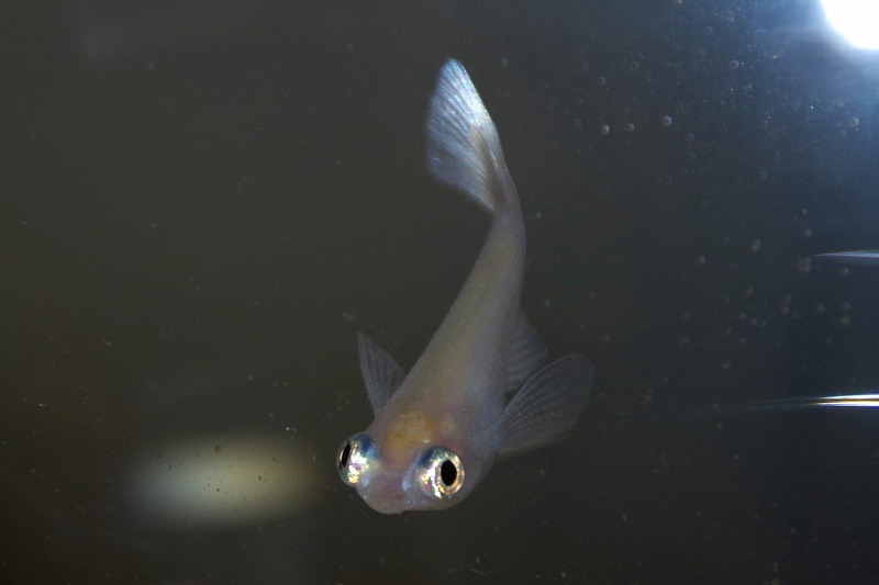 目が飛び出るのは金魚だけではありません。出目透明鱗白(でめとうめいりんしろ)メダカ。正面から見ると、小さいながらも目が出ているのがわかりますね。
