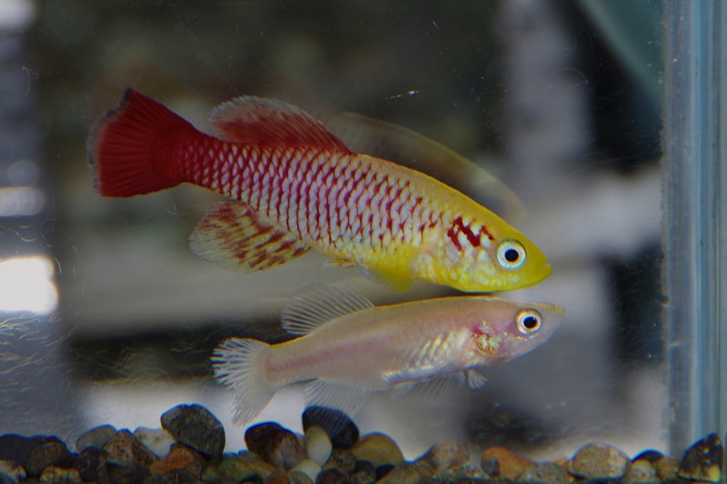 乾季になると水が干上がるので数カ月しか生きられないのは、卵生メダカの1年生魚。ノソブランキウス・ギュンテリーもその仲間です。派手な色がオスで、色の白いのがメス。乾燥に耐える耐久卵は、次の雨期になると孵化します。