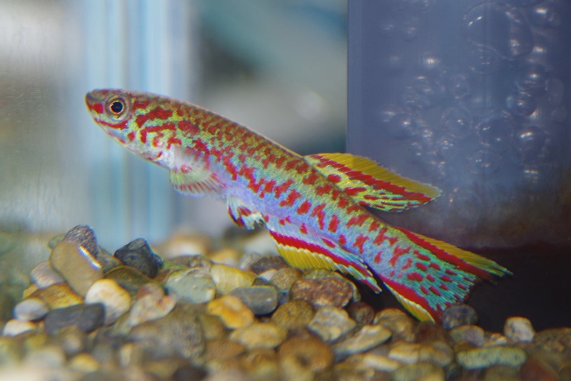 全身が極彩色で彩られるアフィオセミオン・ガードネリー。派手なのはオスで、メスはとっても地味な色。寿命が2~3年で卵生メダカの多年生魚と呼ばれます。