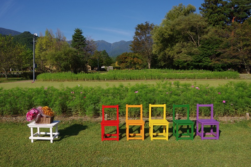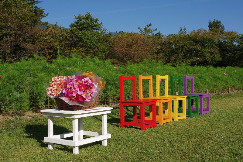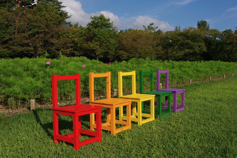 コスモス畑のある段々原っぱに現れたのは、カラフルな5色のイス。今年初登場のフォトスポットです。みんな揃って腰かけて、記念写真を撮りましょう。