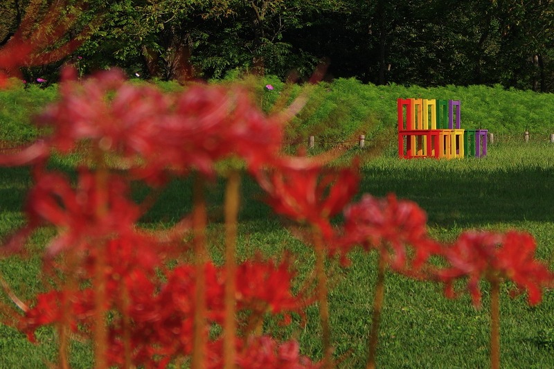 その鮮やかさは、フォトスポットのカラフルな5脚のイスにも負けていませんよ。ちょうど秋の彼岸の頃に咲いてくれるなんて、期待を裏切らないですね。