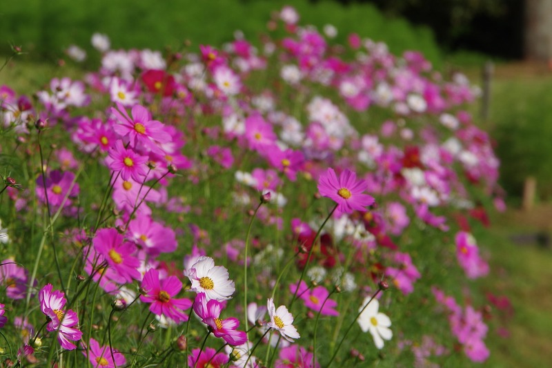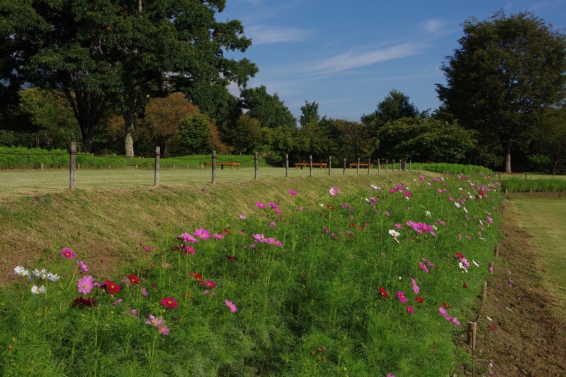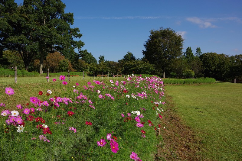 早朝は空一面雲に覆われていましたが、開園時間の頃には青空が広がりました。田園文化ゾーン・段々原っぱのコスモスは、先週末に比べ開花が進んでいます。