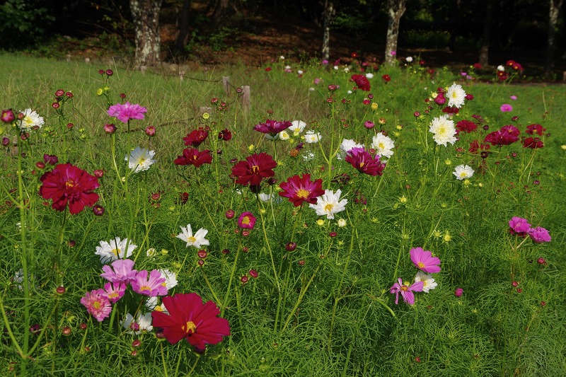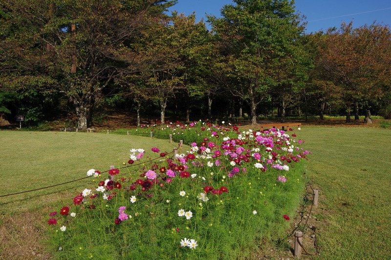 段々原っぱのコスモスは一部咲き始め。野の休憩所前が最も早いようです。ここ数日は気温もグンと下がり、秋らしい陽気になっていますよ。