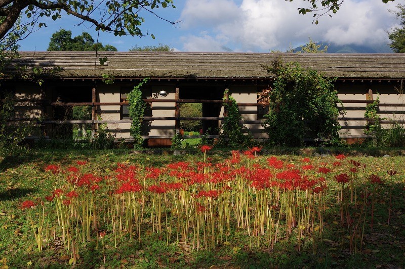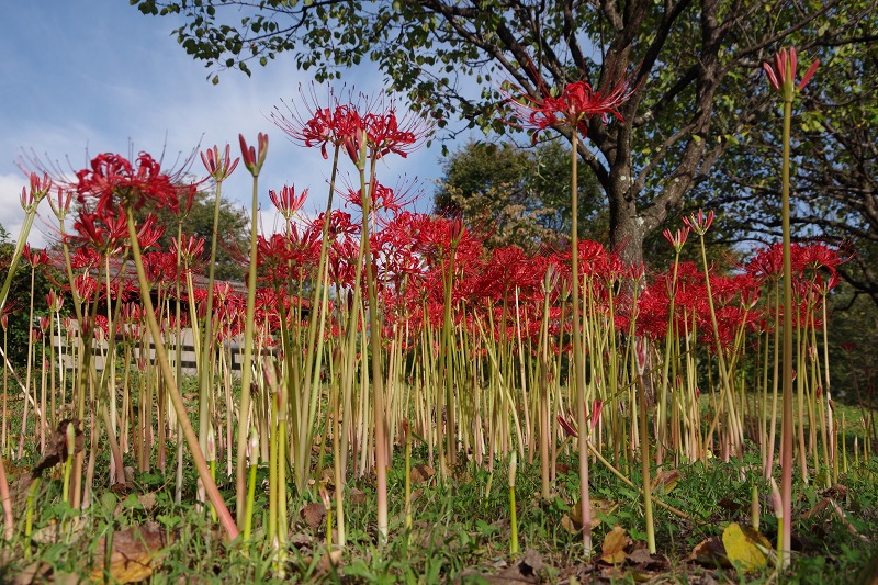 野の休憩所の裏側ではヒガンバナも咲いていました。今がちょうど見頃です。他にも園内各所で咲いている場所があるので、散策しながら探してくださいね。