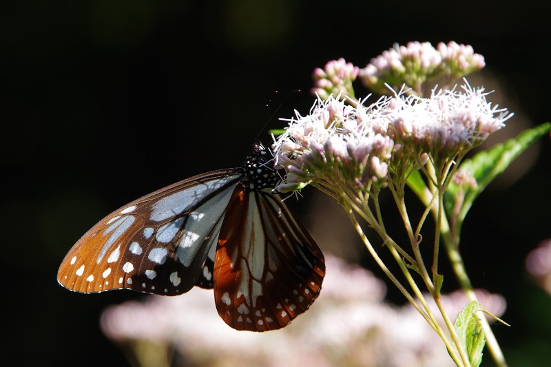 カメラのファインダーを覗くと前翅の白い部分に模様が見えたので、マーキングされた個体かと思ったのですが、よく見るとフジバカマの雌しべの陰でした。