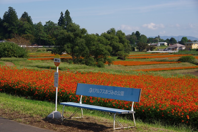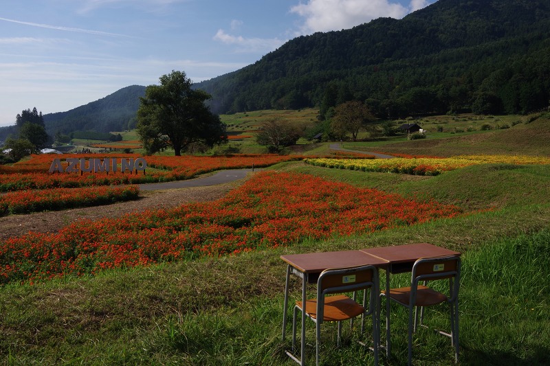 岩原口近くには、勉強机と椅子のフォトスポット。去年はコスモス畑の中にありましたが、今年はAZUMINOのロゴの手前、1段高い場所に設置しました。