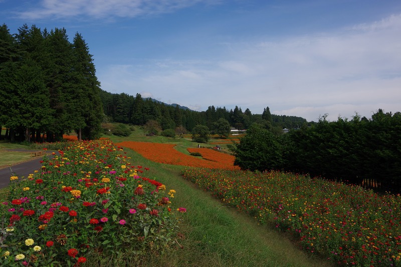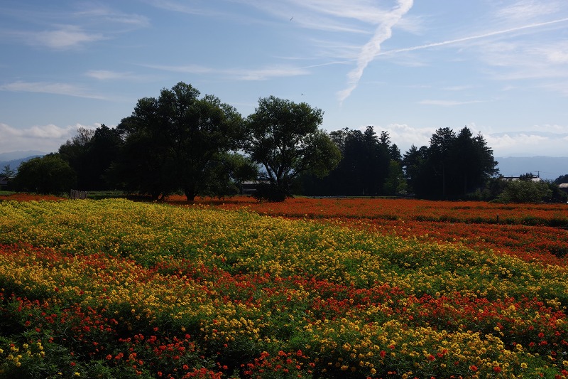 キバナコスモスが全体で楽しめるのは、今週末5日の日曜日までです。翌日からは順次刈り取りが始まります。ジニアも同じく刈り取りますよ。