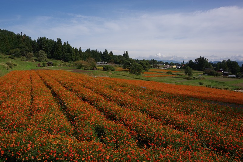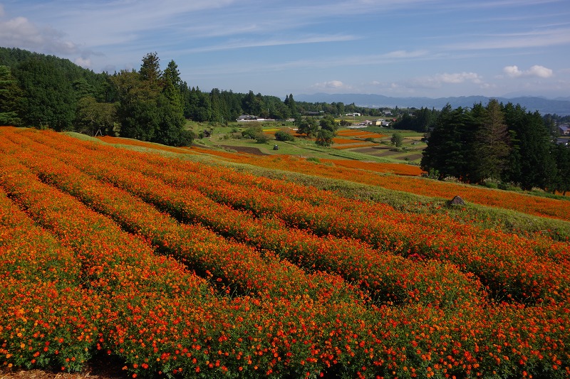 里山文化ゾーンのキバナコスモスは見頃のピークを迎えています。岩原口近くから棚田エリアの上の方まで、オレンジ色のコスモス畑が続きます。