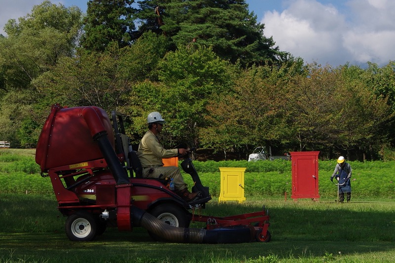 今日は朝から草刈り作業が行われていました。お馴染みのフォトスポット〝風景の扉〟の前でも芝刈り機が活躍。スッキリしてお客様を迎えられそうです。