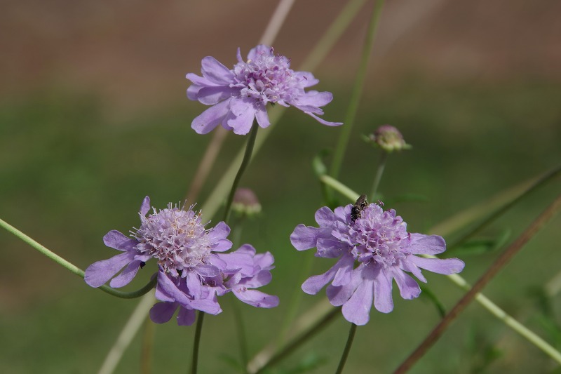 そんな段々花畑では秋の山野草が咲いています。薄紫色のマツムシソウ。花の中央がこんもりとしている所が可愛いですね。