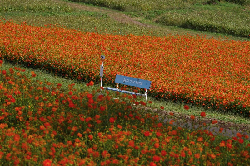 一画だけ黄色いコスモス畑。これは試験的に植えたそうです。畑ごとにオレンジと黄色を交互に植えてみるのも良さそうですね。