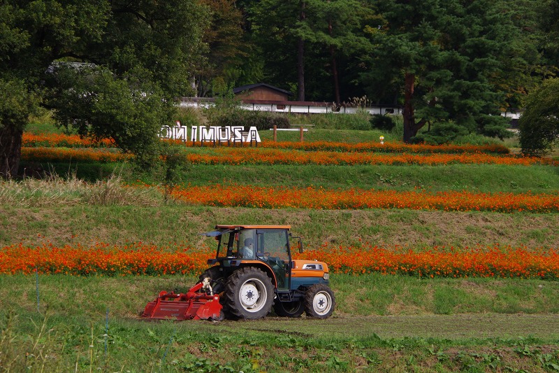 昨日も赤いトラクターの耕耘作業。来年のゴールデンウィークに間に合うように種を蒔くのです。明日・明後日は、最後のキバナコスモス見てくださいね。