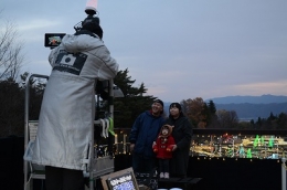 イルミネーションを背景に記念撮影いたします。ポストカード(小サイズ)は無料、大きなサイズのお写真は1200円で購入いただけます。