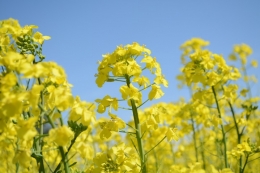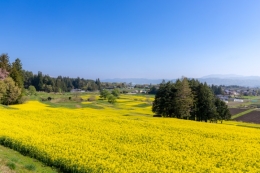 あづみのを眼下に500万本のナノハナの大規模花畑が春の棚田を飾ります! ◇場所/里山文化ゾーン 棚田エリア ※岩原口より入園、第2駐車場をご利用ください ◇植栽面積/6ha ◇植栽規模/500万本 ◇見頃時期/4月下旬~5月上旬