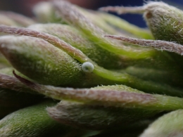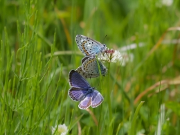オオルリシジミは、瑠璃色の翅がきれいな大型のシジミチョウです。1年に一度だけ成虫が出現するチョウで、5月中旬~6月中旬に成虫が現れ産卵します。約1週間後には孵化して幼虫となり、7月から蛹として約10カ月を過ごします。幼虫はマメ科のクララという植物の蕾と花しか食べません。