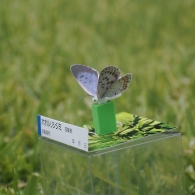 昔、安曇野の山野に舞っていた貴重なチョウ「オオルリシジミ」。イベントではさなぎを池周辺に放します。