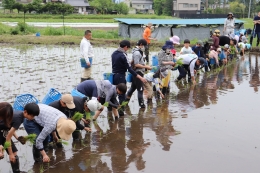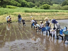 里山文化再生エリアの水田で、お米作りに必要な作業を行うボランティア。