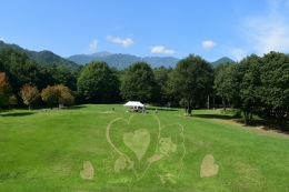 今年もアルプス大草原に巨大地上絵(芝生アート)が登場! 3年目となる本年のデザインは、公園キャラクターの草太(そうた)と木子(もっこ)がハートを抱える愛らしいモチーフです。撮影は、大草原の家のデッキ手すりの中央部からのアングルがおすすめ! 北アルプスの壮大な景観とともに11月下旬ごろまでお楽しみいただけます。