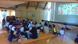 会場の「大草原の家」に設置された大型スクリーンで、親子で楽しめる作品をゆったりご鑑賞いただけます。