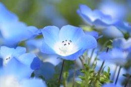 ネモフィラは北アメリカ原産の一年草で、澄んだ瑠璃色の花を咲かせます。葉が唐草模様に似ていることから、和名では「瑠璃唐草(るりからくさ)」と呼ばれています。また、白い中心をもつ小さな青い花姿から、英語では「Baby blue eyes」の名でも親しまれています。なお、「ネモフィラ」という名前は、ギリシャ語の「ネモス(小さな森)」と「フィレオ(愛する)」に由来しています。