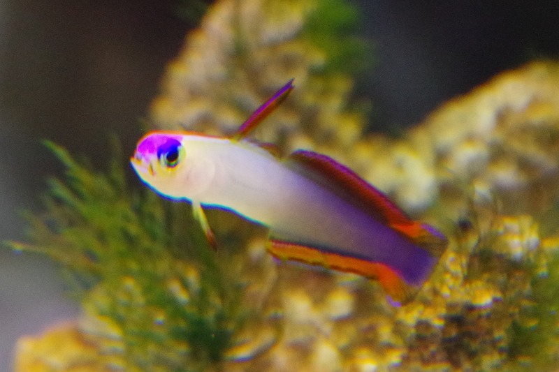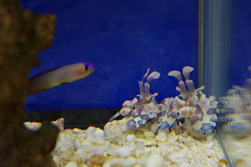 フリソデエビがいるのも水槽の隅っこ。この場所が安心できるようです。そんなフリソデエビの近くに、ひょっこりと顔を出しているお魚が新しく仲間入り。