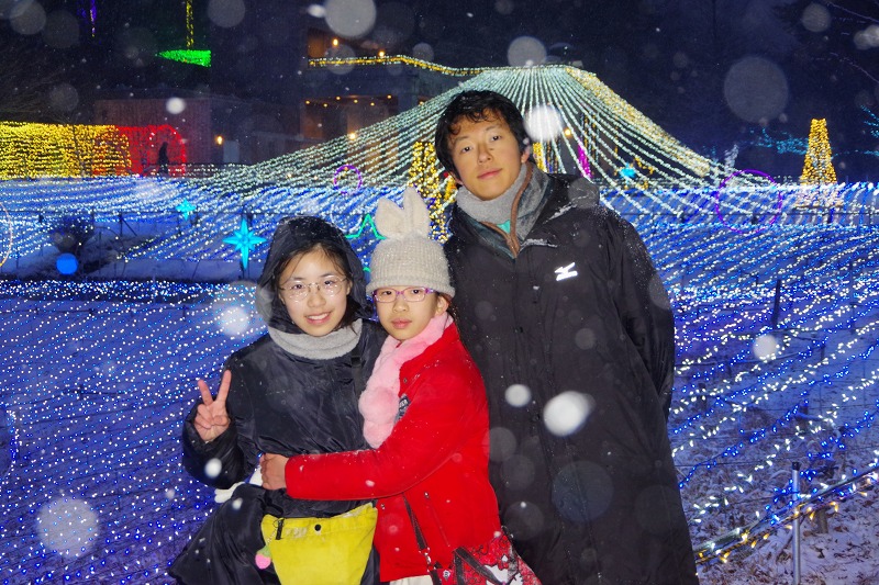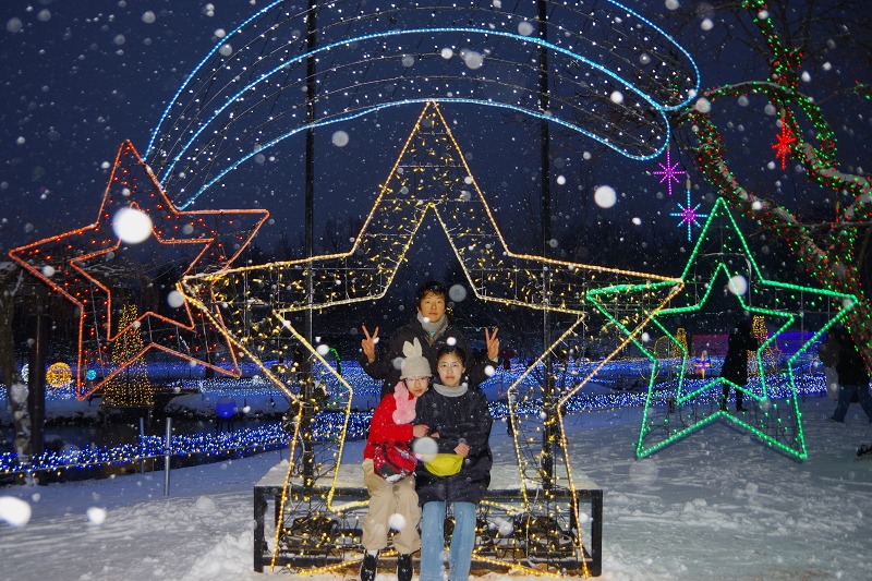 雪が降る中フラッシュ撮影をすると、雪に光が反射して空中でイルミネーションが輝いているようです。キラキラが増えて得した気分ですね。