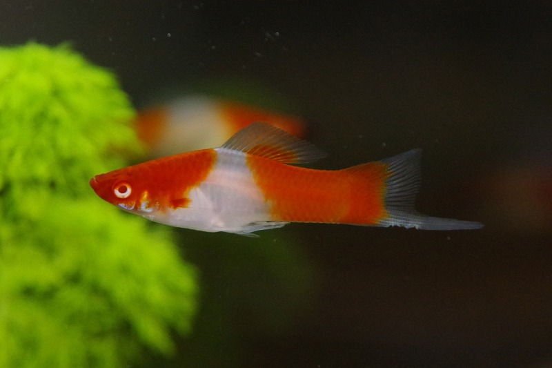 赤と白の体色がおめでたい〝紅白ソードテール〟です。赤い目はアルビノの特徴。卵胎生メダカの仲間で、オスは尾びれの下端が剣のように伸びます。